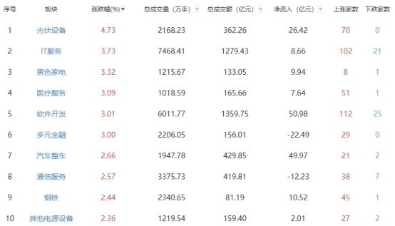 板块方面,光伏设备、IT服务、黑色家电等板块涨幅居前,银行、小金属板块下跌。